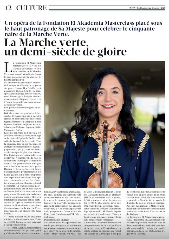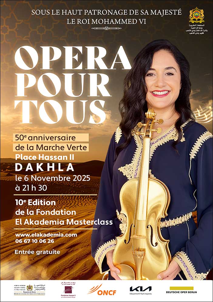 Die El Akademia Masterclass Foundation und die Stadt Dakhla feiern den 50. Jahrestag des Grünen Marsches mit einer einzigartigen Aufführung. Die eigens für diesen Anlass konzipierte Oper wird am 6. November 2025 um 21:30 Uhr im Freien auf dem Hassan-II.-Platz in Dakhla aufgeführt.